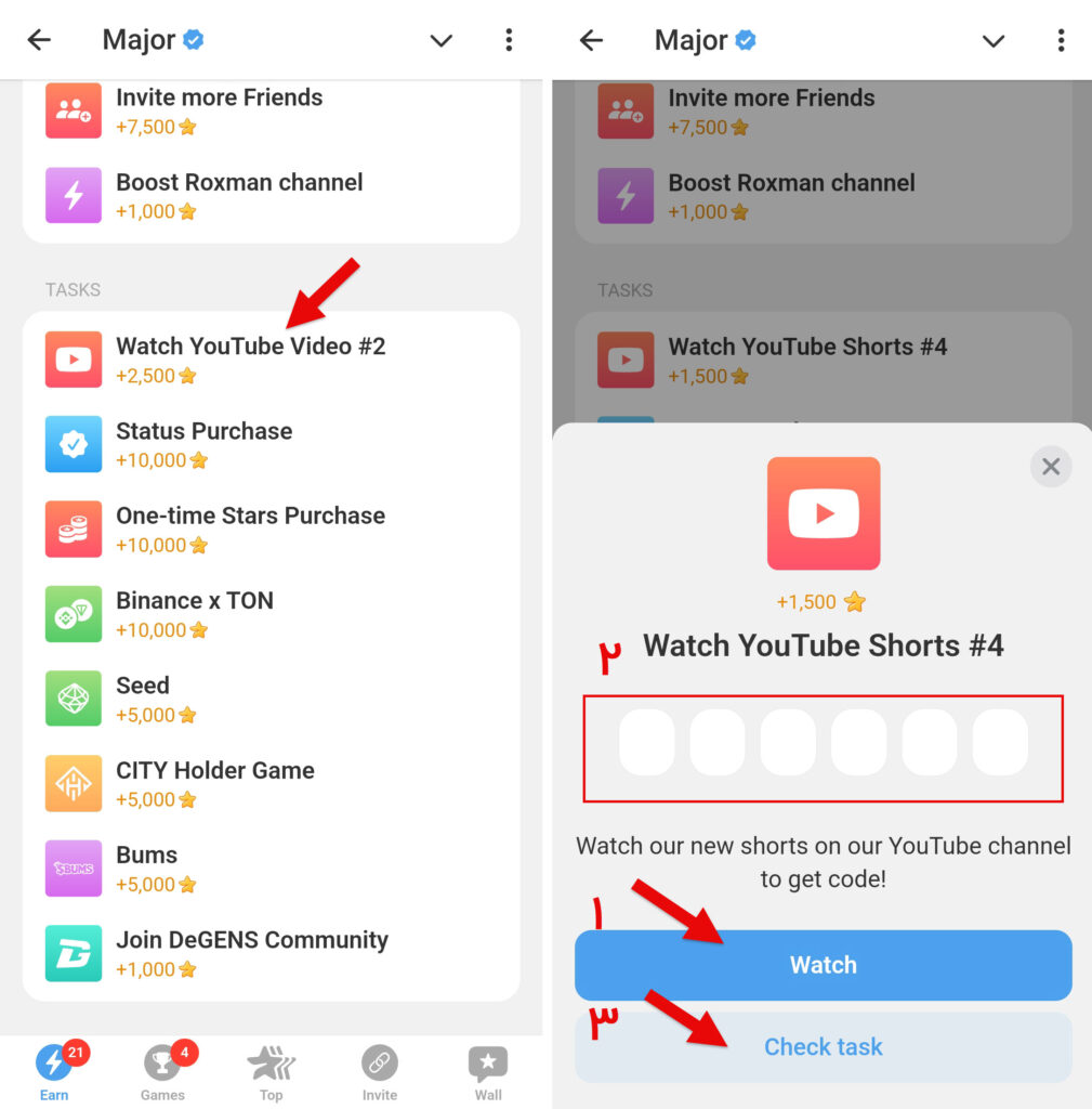 برای وارد کردن کد اصلی ویدیو از منوی پایین به قسمت Earn رفته و روی فیلم مورد نظر کلیک کنید. پس از فشار دادن دکمه Watch، از یوتیوب به تلگرام برگردید و با استفاده از راهنمای این مقاله، کد را بسته به شماره ویدیو وارد کنید.